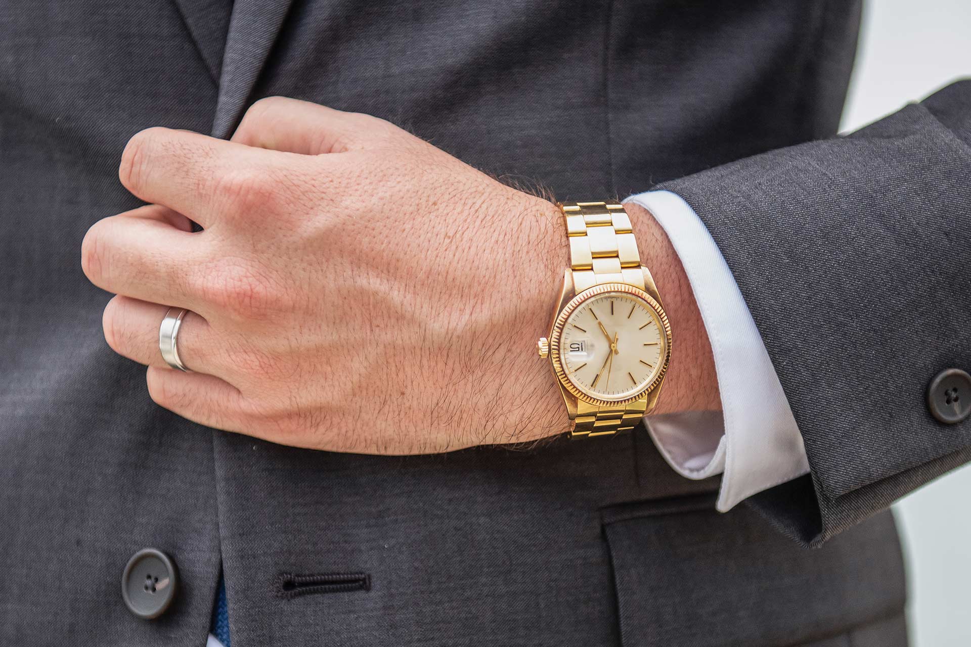 A 18k gold presidential style braclet with single deployment clasp secures the watch to your wrist.